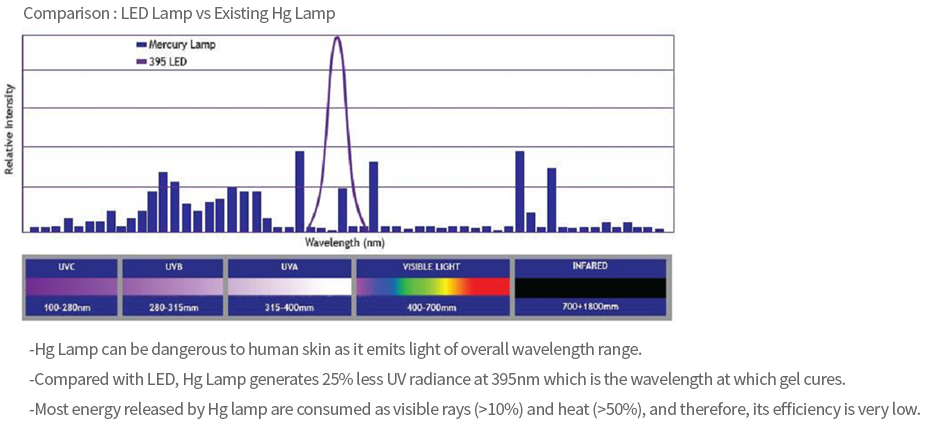 ㆍAmount of UV exposure during gel curing : About 13,000 times of UV lamp usage is equivalent to using 40,000 times of UV LED.