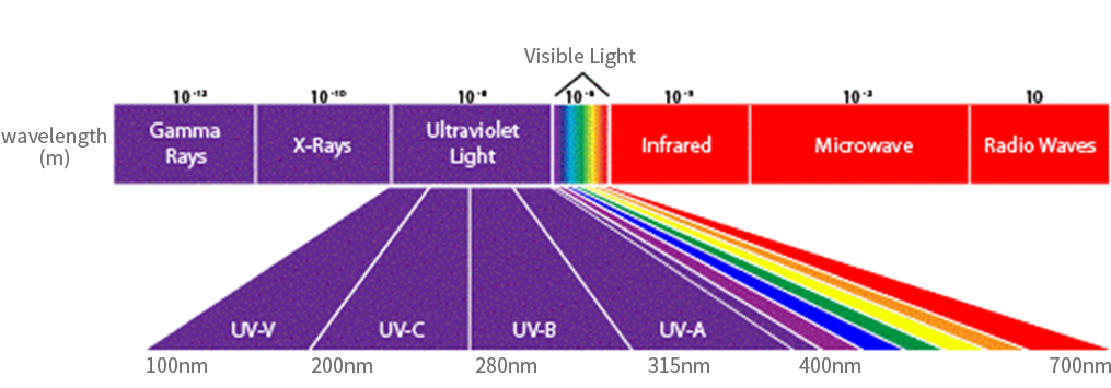 자외선은 UV(ultraviolet rays)라고도 하며 한자로는 자외선(紫外線)이다. 가시광선의 파장(400nm)보다는 짧고 X선(100nm)보다는 긴 파장을 가진 전자기파를 말한다. 태양광선은 감마선, 엑스선, 자외선, 가시광선, 적외선, 라디오파 등으로 구성되어 있으며, 이는 파장에 따라 각각 구별한다. 자외선은 3영역으로 나눌 수 있으며, 각 특성에 따라 실생활에 많이 활용되고 있다. 자외선의 파장은 다음과 같이 분류된다.